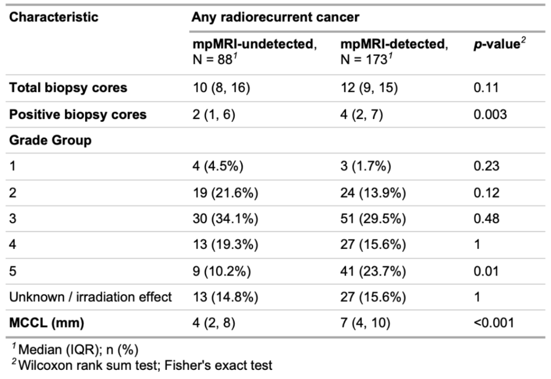 该研究结果表明,在mpMRI未检测到的肿瘤中,分级分组为5的肿瘤相对较少、MCCL更短、阳性穿刺针数也更少。mpMRI在放疗后疑似影像学复发的患者中,具有中等的检测敏感性和特异性,而且可能有将近30%的任何癌症漏诊。因此,单用mpMRI不足以诊断和定位影像学复发性前列腺癌。