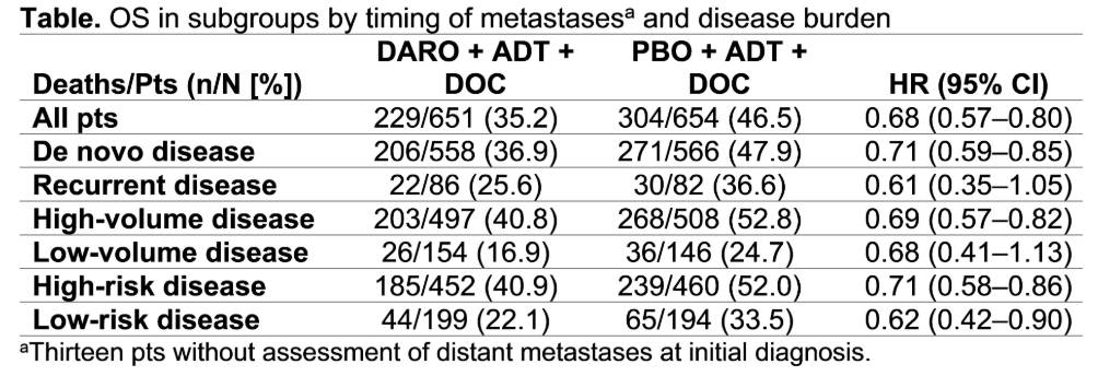 达罗他胺(DARO)联合雄激素剥夺疗法(ADT)和多西他赛(DOC)治疗转移性激素敏感性前列腺癌(mHSPC)患者的疗效和安全性:ARASENS研究亚组分析(摘要号:A1183)