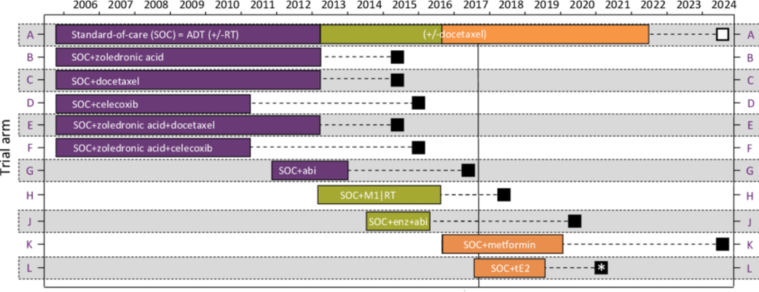 STAMPEDE是迄今前列腺癌领域规模最大的、多臂多阶段、3期研究,旨在评价在标准治疗(SOC)基础上联合不同新型药物的获益,但随着时间推移,SOC也发生变化。已经报道的STAMPEDE-B研究显示,在SOC(ADT或ADT+DOC)基础上联合唑来膦酸并不能改善患者OS,但该研究并未报道唑来膦酸对骨健康事件的影响。