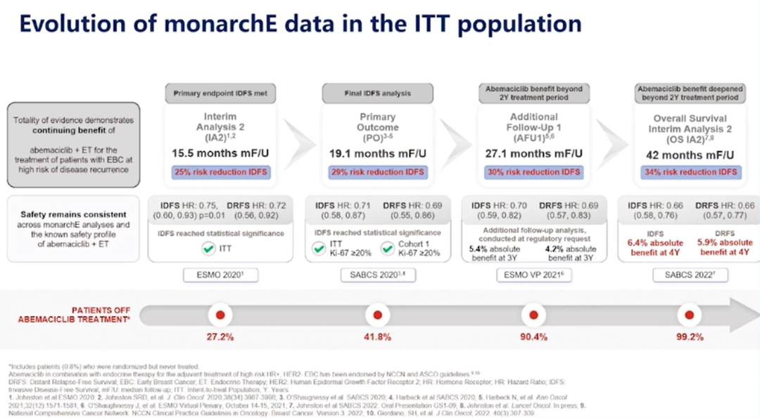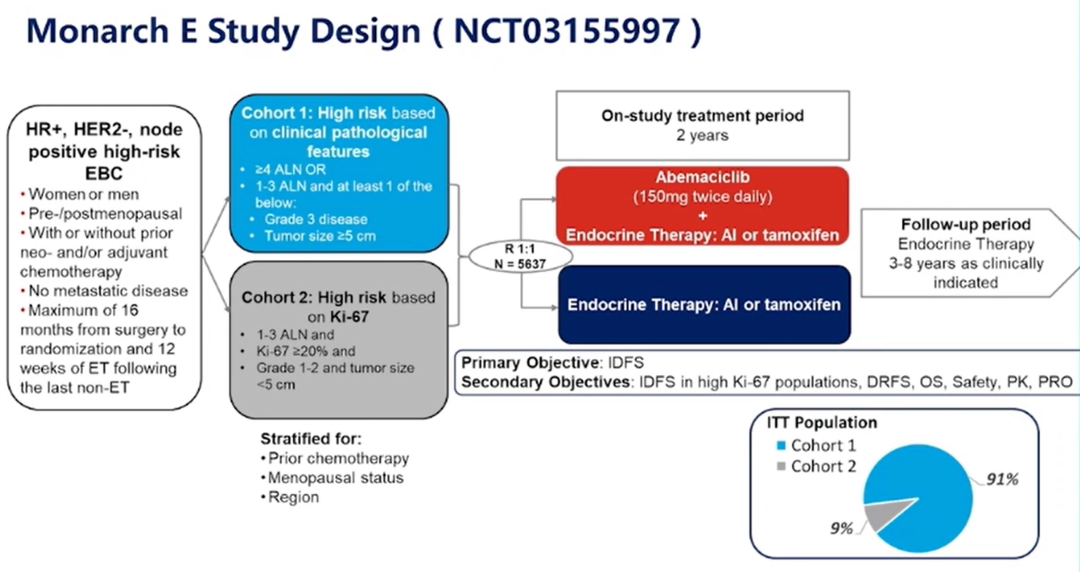 MonarchE是目前唯一一个CDK4/6抑制剂辅助内分泌治疗获得成功的3期临床试验。该研究入组患者包括2个队列:队列1是≥4枚腋窝淋巴结(ALN)阳性患者,或1-3枚ALN阳性且为G3或肿瘤≥5cm的患者;队列2是1-3枚ALN阳性且Ki-67≥20%的G 1-2和肿瘤<5cm患者。意向性治疗人群(ITT)包括队列1和队列2。主要终点是ITT人群的无浸润性疾病生存(IDFS);次要终点包括Ki-67高危人群的IDFS、无远处复发生存(DRFS),总生存(OS)等。