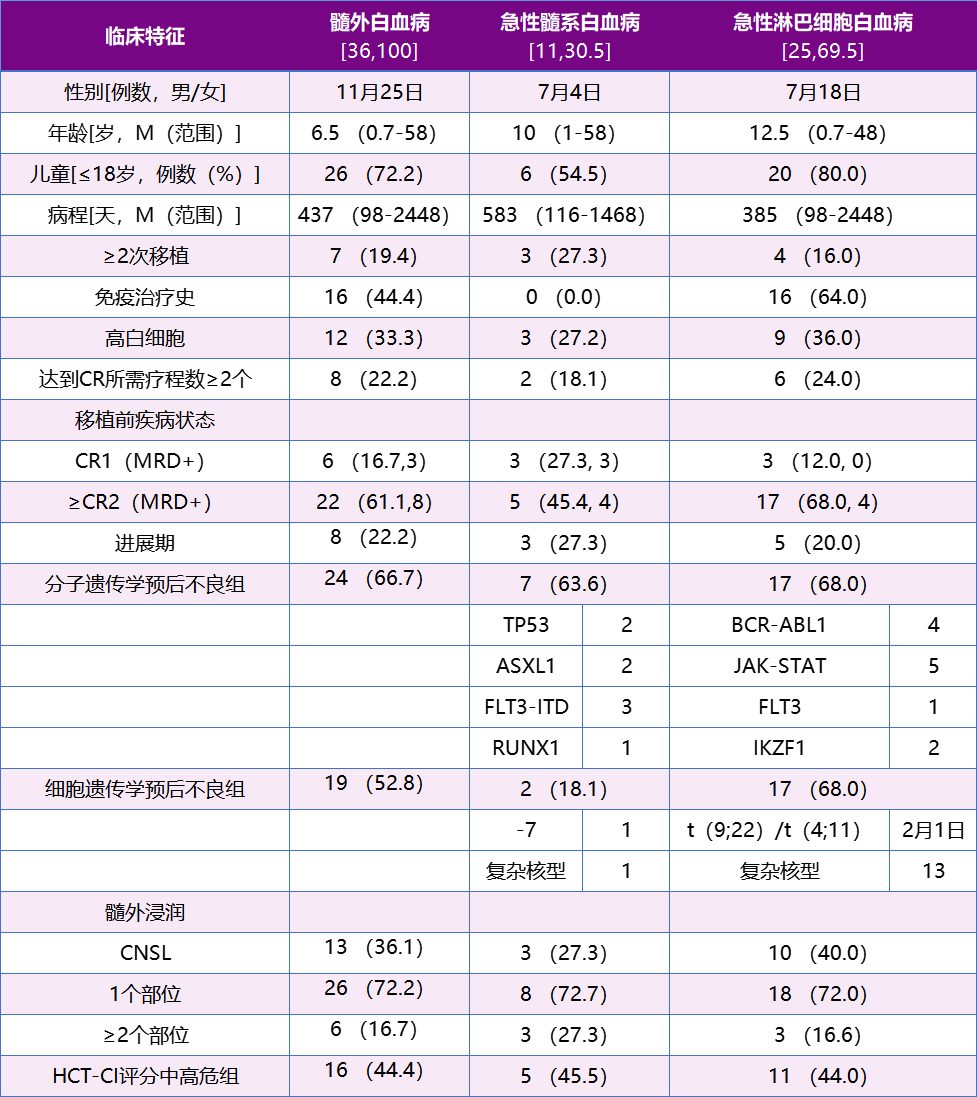 患者的临床特征如表1所示,入组36例患者中,急性髓系白血病11例,急性淋巴细胞白血病25例,其中急性B淋巴细胞白血病16例,急性T淋巴细胞白血病9例。男性25例,女性11例,中位年龄6.5(0.7-58)岁。疾病不良预后及分层因素包括高白细胞起病12(33.3%)例,分子遗传学预后不良组24(66.7%)例,细胞遗传学预后不良组19(52.8%)例。合并中枢神经系统白血病16(44.4%)例,髓外浸润26(72.2%)例。