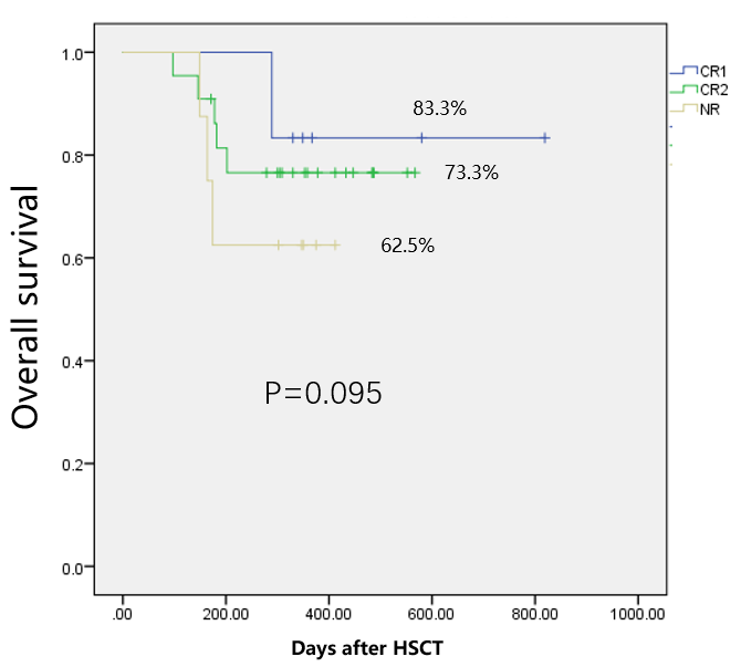 图1.移植前疾病处于CR1、CR2及NR的患者经移植后的总体生存率
