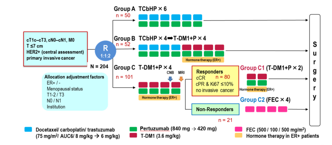 研究背景:Ⅱ期Neo-peaks研究比较了多西他赛+卡铂+曲妥珠单抗+帕妥珠单抗(TCbHP)与标准TCbHP方案后恩美曲妥珠单抗+帕妥珠单抗(T-DM1+P)新辅助治疗的有效性。在TCbHP治疗之后,继续T-DM1+P治疗方案的pCR率在数值上更高(Masuda N et al Breast Cancer Res Treat 2020;180:135-46)。