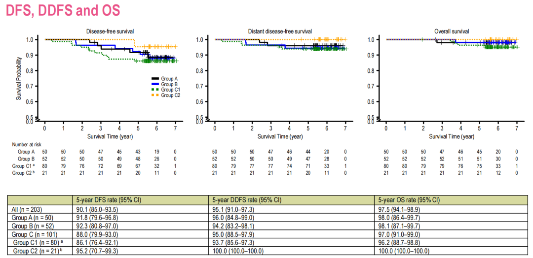 研究方法:Neo-peaks研究于2014年8月~2016年2月纳入了符合条件的HER2阳性乳腺癌患者,主要终点为pCR率,次要终点包括5年无病生存(DFS)、远处无病生存(DDFS)和总生存(OS)。入组患者按照1∶1∶2比例随机分为三组:A组接受TCbHP(6个周期)治疗;B组接受TCbHP联合T-DM1+P(各4个周期)治疗;C组接受T-DM1+P(4个周期)治疗,4个周期后无应答者转为基于蒽环类药物的方案。评估5年无病生存率(DFS)、远处无病生存率(DDFS)和总生存率(OS)。