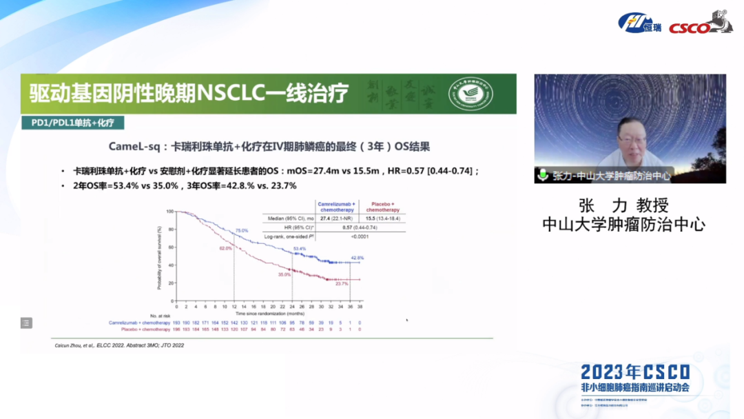 任胜祥教授解读了驱动基因阴性NSCLC的系统治疗更新要点。非鳞癌和鳞癌一线治疗Ⅰ级推荐阵列进一步壮大。同时,既往已成为Ⅰ级推荐方案的多项研究在2022年更新了数据。其中CameL研究公布了4年长生存数据,卡瑞利珠单抗联合化疗一线治疗驱动基因阴性非鳞状NSCLC,3年OS率达到39.3%,4年OS率高达37.2%,使超1/3患者生存突破4年。4年生存率相较3年,仅下降了2%,提示这些患者很有可能生存突破5年,那么随着随访时间的延长,相信卡瑞利珠单抗将进一步提高晚期患者5年生存率,让更多患者实现长期无病生存!中位OS和无进展生存期(PFS)相较对照组均取得显著延长,分别达27.1个月和11.0个月、两者均创下了当前同类Ⅲ期研究中的最长纪录。CameL-sq研究也更新了OS数据,卡瑞利珠单抗联合化疗一线治疗驱动基因阴性鳞状NSCLC的3年OS率达42.8%,中位OS达27.4个月,也是同类Ⅲ期研究中最长。尽管不同研究间无法直接比较,但足见卡瑞利珠单抗联合方案的卓越疗效。