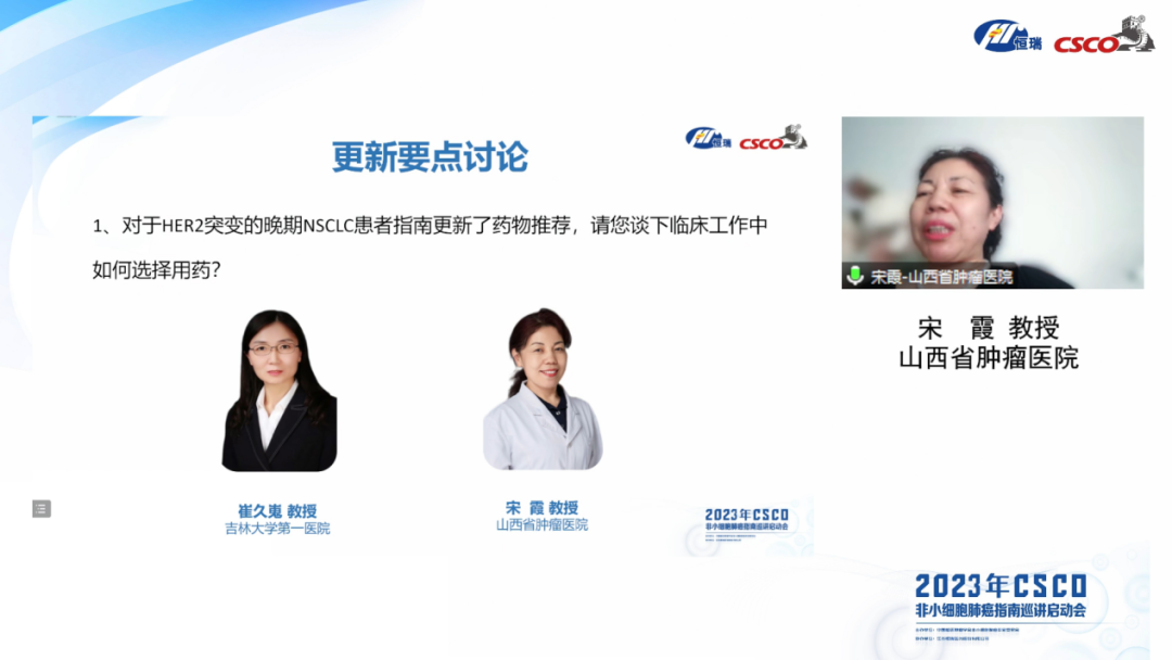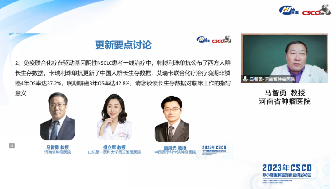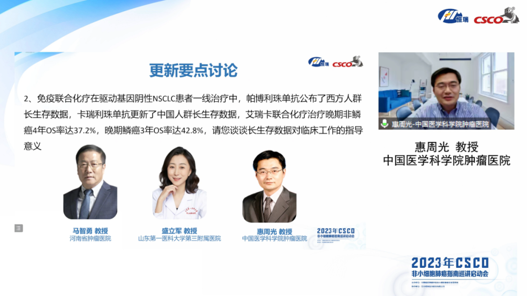讨论环节中,吉林大学第一医院崔久嵬教授、山西省肿瘤医院宋霞教授、河南省肿瘤医院马智勇教授、山东第一医科大学第三附属医院盛立军教授、中国医学科学院肿瘤医院惠周光教授聚焦2023 CSCO指南更新要点展开了深入探讨,包括HER2突变晚期NSCLC后线治疗药物选择、CameL研究和CameL-sq研究4年更新长生存数据对中国临床的指导意义等。专家表示,药物可及性和基于中国患者生存的直接证据仍是临床实践的关键考量要素,吡咯替尼仍将是HER2突变晚期NSCLC后线治疗的可及治疗方案;CameL和CameL-sq均是在中国人群中开展的大样本III期研究,卡瑞利珠单抗联合化疗使近四成的非鳞癌患者生存超过了4年,耀眼数据可圈可点,卡瑞利珠单抗已纳入医保,堪当晚期NSCLC一线治疗中的标准治疗基石。