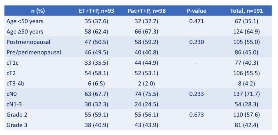 研究结果:所有患者中pCR率为39.3%,其中内分泌联合双靶(TP+ET)组pCR率为23.6%,紫杉醇联合双靶(TP+wPac)组pCR率为53.9%。