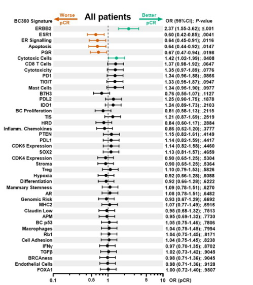 (1)BC360分析显示,在总体人群中ERBB2表达(OR 2.37;95%CI:1.55~3.62)及细胞毒性特征(OR 1.42;95%CI:1.02~1.99)是pCR的预测因子,而凋亡(OR 0.64;95%CI:0.44~0.92)、雌激素受体1(OR 0.60;95%CI:0.42~0.85)、雌激素受体信号(OR 0.64;95%CI:0.45~0.91)、孕激素受体(OR 0.67;95%CI:0.47~0.94)特征为不利于达到pCR的因子。在TP+wPac组中结果与之类似,但在TP+ET组中只有ERBB2与pCR显著相关。