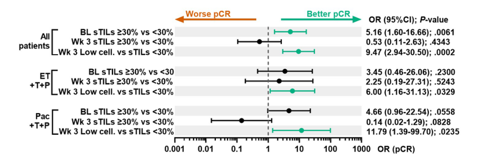 研究方法:207例经中心确认的早期TPBC患者(cT1-cT4,cN0-3)被随机分成两组,分别接受12周标准内分泌治疗或紫杉醇80mg/m2周疗方案,两组均同时接受曲妥珠单抗+帕妥珠单抗的双靶治疗方案(TP+ET,100例,TP+wPac,107例)。使用NanoString BC360分析基线时穿刺活检组织中的基因表达(TP+ET,72例;TP+wPac,78例)。分别在基线(TP+ET,93例;TP+wPac,97例)和第3周时(TP+ET,65例;TP+wPac,57例)分析sTILs。用logistic回归分析法分析BC360基因表达特征和sTILs对pCR(ypT0/is、ypN0;主要终点)的优势比(odds ratio,OR)。