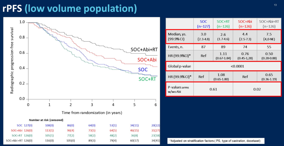 今年ASCO公布的PEACE-1研究最新数据也证实了放疗在低瘤负荷人群的治疗价值,尤其是放疗联合三联强化治疗,在低瘤负荷患者中,SOC(即ADT±化疗)+阿比特龙+放疗(SOC+Abi+RT)组患者的rPFS相较于SOC+Abi有显著延长(4.4 vs 7.5年,HR 0.50,P=0.02);但略有遗憾的是,两组间的OS没有显著差异(6.9年vs未达到,HR 0.77,P=0.21)。此外,SOC+Abi+RT可以显著延缓去势抵抗性进展(3.6 vs 6.9个月,HR 0.62,P=0.006)和减少严重生殖-泌尿事件(事件数:45 vs 24,P=0.018)。