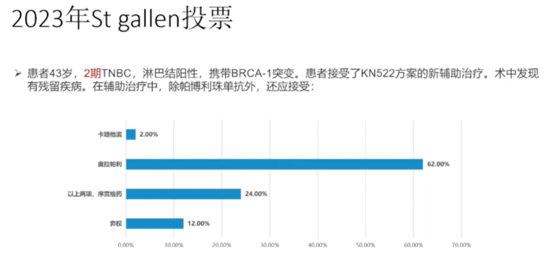 2、患者携带BRCA-1突变,接受了KEYNOTE-522方案的新辅助治疗,术中发现有残留疾病。在辅助治疗中,除帕博利珠单抗外,您会考虑奥拉帕利吗?