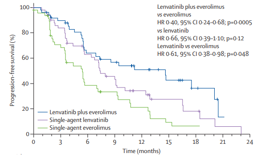 在靶向联合靶向治疗方面,STUDY205研究进行了探索。该研究为仑伐替尼单药或联合依维莫司二线治疗转移性肾细胞癌的随机、Ⅱ期、开放、多中心临床试验,研究结果表明仑伐替尼联合依维莫司相比于依维莫司单药,可显著延长PFS(14.6 vs.5.5个月)和OS(18.5 vs.16.5个月)[2]