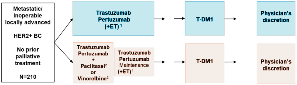 A组患者治疗方案:帕妥珠单抗(负荷剂量840 mg静脉注射[IV],随后420 mg IV,每3周一次)+曲妥珠单抗(负荷剂量8 mg/kg IV,随后6 mg/kg IV,每3周一次),无化疗,雌激素受体ER阳性的联合内分泌治疗。B组患者治疗方案:帕妥珠单抗+曲妥珠单抗+紫杉醇(第1、8和15天90 mg/m2,每4周一次,持续≥4个月)或长春瑞滨(首次给药25 mg/m2,随后第1和8天30 mg/m2,然后每3周一次,持续≥4个月),化疗中止后接受帕妥珠单抗+曲妥珠单抗维持治疗,其中ER阳性的可联合内分泌治疗。终点指标:主要终点是24个月OS,次要终点包括一线和二线治疗的PFS、患者报告的QOL和安全性。
