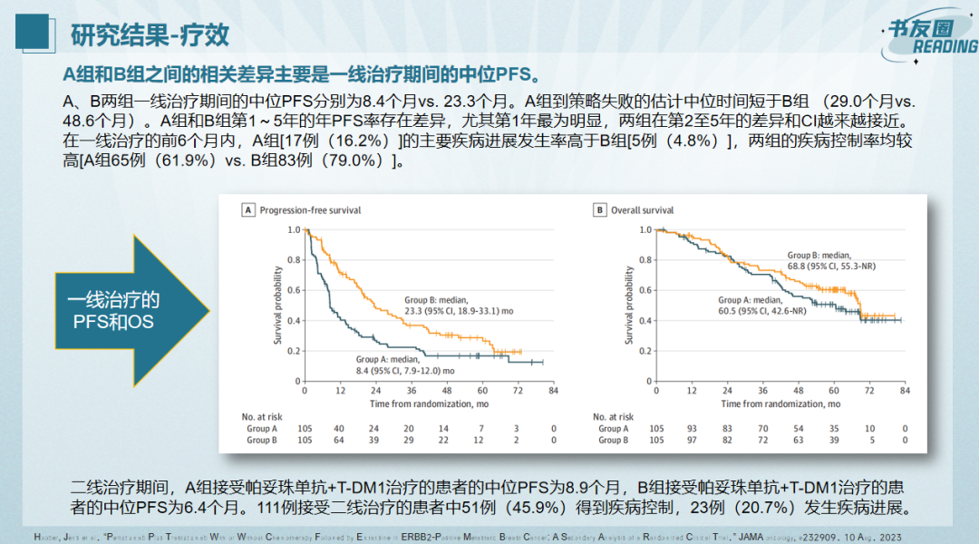 二线治疗期间,A组接受帕妥珠单抗+T-DM1治疗的患者的中位PFS为8.9个月,B组接受帕妥珠单抗+T-DM1治疗的患者的中位PFS为6.4个月。111例接受二线治疗的患者中51例(45.9%)得到疾病控制,23例(20.7%)发生疾病进展。