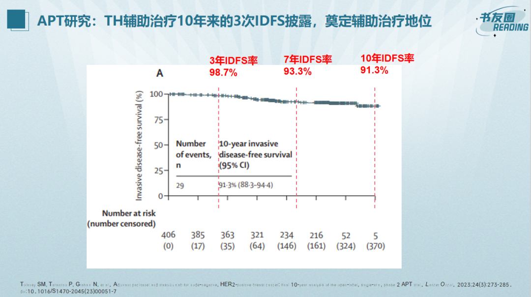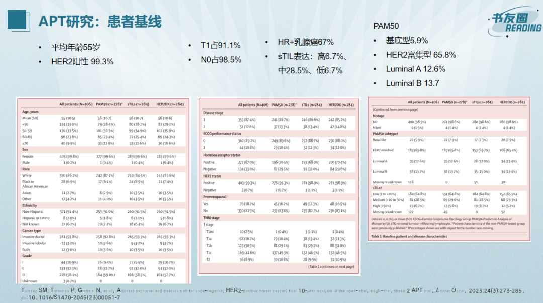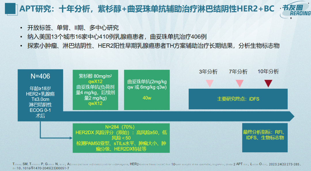 APT是一项开放标签的单臂多中心II期研究,纳入了美国13个城市、16家中心410例年龄≥18岁、ECOG评分为0~1分、肿瘤≤3cm、淋巴结阴性的HER2阳性乳腺癌患者。术后每周静脉注射紫杉醇(80mg/m2)+曲妥珠单抗(首次4mg/kg,随后每次2mg/kg)连续12周。此后,根据研究者的选择,再予曲妥珠单抗(每周2mg/kg或每3周6mg/kg)连续40周,以完成1年的辅助治疗。保乳手术的患者在治疗方案开始前接受部分乳腺照射或在紫杉醇治疗完成后接受全乳照射。激素受体阳性患者允许在紫杉醇治疗完成后接受辅助内分泌治疗。研究主要终点为侵袭性无病生存事件(iDFS),次要终点包括无复发生存率、OS、乳腺癌特异性生存率,并采用HER2DX基因组工具进行探索性分析。
