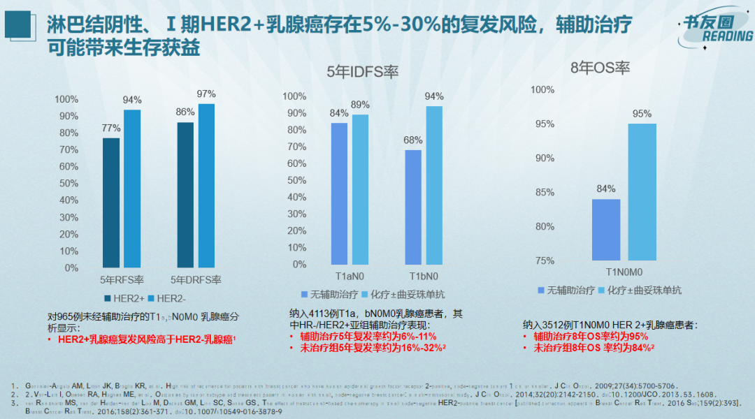 范照青教授在讲课中提到,淋巴结阴性、Ⅰ期HER2阳性乳腺癌存在5%~30%的复发风险,辅助治疗可能带来生存获益。对于这些患者,既往的辅助治疗相关研究探索较少且多为回顾性研究,因此APT研究对于这些人群的治疗进行了前瞻性探索。