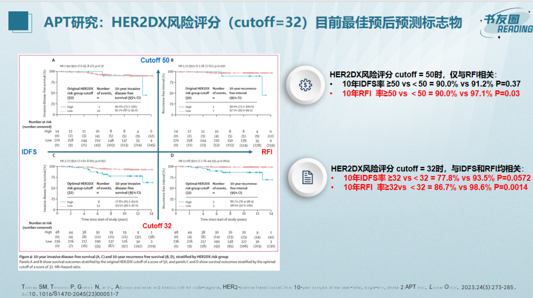 APT研究确立了降阶梯的TH方案可作为小肿瘤、淋巴结阴性、HER2阳性乳腺癌患者的标准辅助治疗方案;10年IDFS率91.3%,进一步巩固了HT方案的地位。研究发现PAM50 Luminal B患者的10年RFI低于基底样、HER2富集或Luminal A肿瘤患者;sTIL低表达较高表达略差,但仍需要进一步验证其对预后的影响;HER2DX风险评分可作为此类患者预后预测因素,可以cut off=32作为参考,极具应用前景。