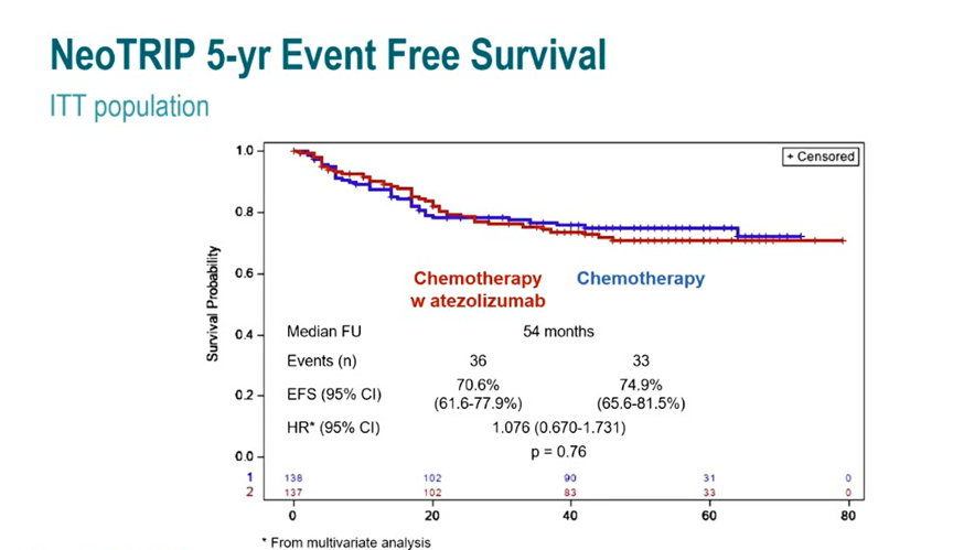 2、Gianni L,et al.Event-free survival(EFS)analysis of neoadjuvant taxane/carboplatin with or without atezolizumab followed by an adjuvant anthracycline regimen in high-risk triple negative breast cancer(TNBC):NeoTRIP Michelangelo randomized study.ESMO Congress 2023,LBA19