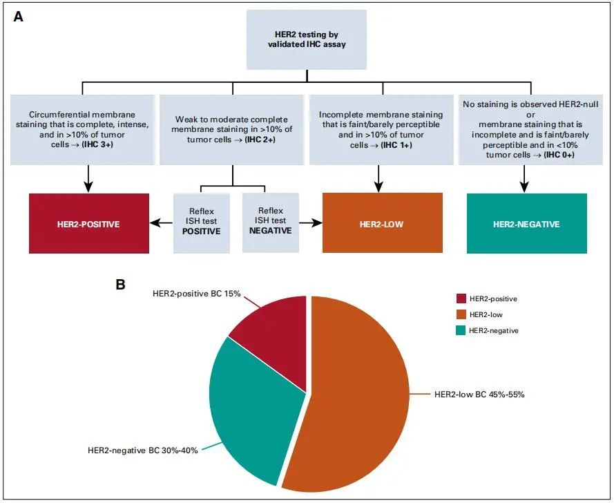 根据ASCO/CAP发布的HER2检测指南[1],HER2阳性乳腺癌定义为:至少一个肿瘤样本IHC评分为HER2 3+或ISH存在HER2过度表达或基因扩增。按照此定义,临床中仅有15%的乳腺癌患者为“HER2阳性”,而实际上仍有高达45%~55%的患者为“HER2低表达”,即IHC评分为HER21+或2+且ISH阴性的患者[2]。