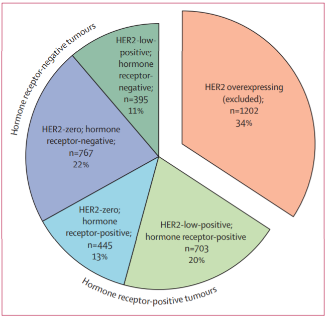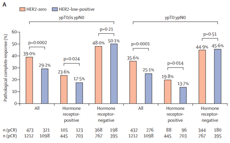 该研究对2012年7月30日至2019年3月20日期间的4项前瞻性新辅助治疗临床试验(GeparSepto,NCT01583426;GeparOcto,NCT02125344;GeparX,NCT02682693;Gain-2 neoadjuvant,NCT01690702)的2310例患者进行汇总分析。其中,HER2低表达1098例,HER2零表达1212例(47.5%vs 52.5%)[3]。