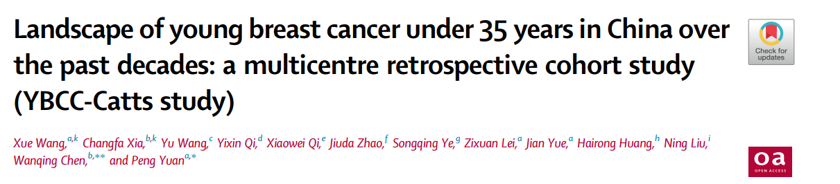 Wang X,Xia C,Wang Y,Qi Y,Qi X,Zhao J,Ye S,Lei Z,Yue J,Huang H,Liu N,Chen W,Yuan P.Landscape of young breast cancer under 35 years in China over the past decades:a multicentre retrospective cohort study(YBCC-Catts study).EClinicalMedicine.2023 Sep 22;64:102243.doi:10.1016/j.eclinm.2023.102243.PMID:37936654;PMCID:PMC10626170.