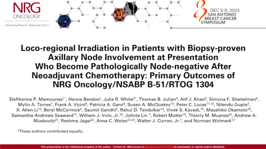 Loco-Regional Irradiation in Patients with Biopsy-proven Axillary Node Involvement at Presentation Who Become Pathologically Node-negative After Neoadjuvant Chemotherapy:Primary Outcomes of NRG Oncology/NSABP B-51/RTOG 1304.SABCS 2023.GS02-07.