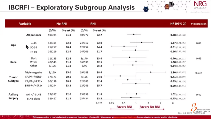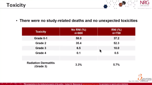 研究结果显示,两组患者在IBCRFI、ILRRFI、DRFl、DFS及OS上均无明显差异,P值没有统计学意义。这表明,对于新辅助治疗后腋窝淋巴结达到ypN0的乳腺癌患者,术后继续行区域淋巴结照射并不能降低乳腺癌局部或远处复发的风险,也无法提高患者的无病生存时间和总生存时间。相反,这增加了放射治疗相关的不良反应。2级不良反应率从35.4%上升到了52.3%,3级不良反应率从6.5%上升到了10%。在亚组分析中,三阴性乳腺癌的患者在术后不照射组的预后似乎更好,而ER/PR+/HER2-乳腺癌患者更倾向于进行术后的放射治疗。然而,讲者没有对此进行详细阐述,需要等待论文发表后的详细解读。