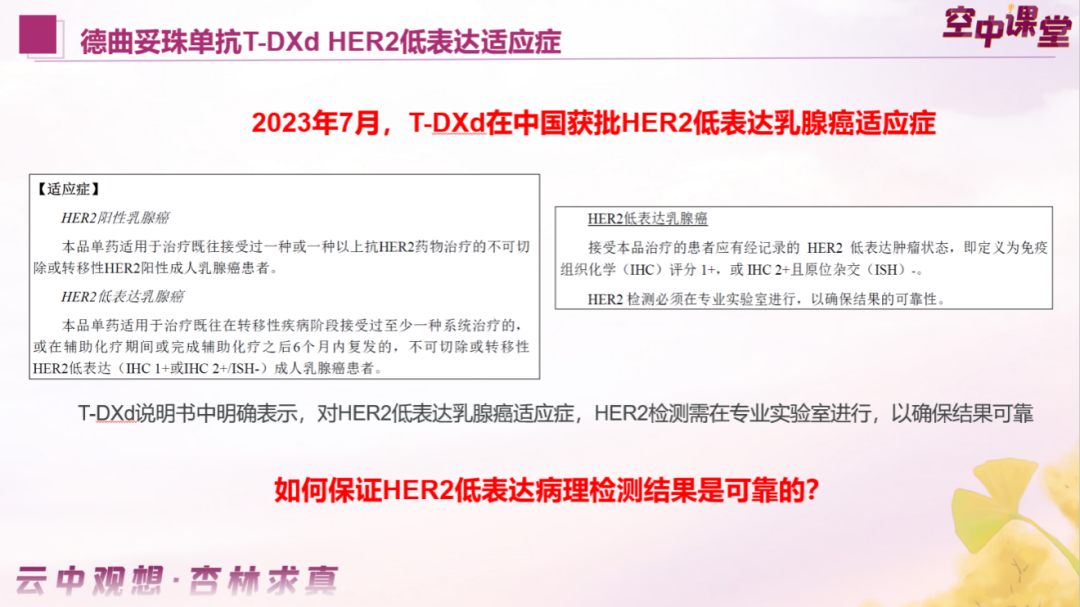 2023年7月,靶向HER2的ADC药物德曲妥珠单抗(T-DXd)在中国正式获批HER2低表达乳腺癌适应症,一方面为此类患者带来了新的治疗希望,同时也对乳腺癌HER2的病理诊断提出了新的要求。确保检测结果的可靠性,成为病理工作者的重要任务。