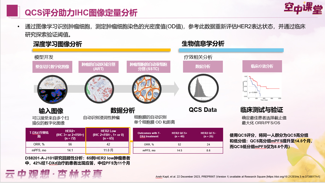 鉴于IHC检测只是半定量方法,正有越来越多的专家在探索其他新的定量检测技术以期能提供更精准的诊断。例如,QCS评分法,也就是定量连续评分,指通过大量图像学习由计算机自动识别浸润性肿瘤细胞后,测定膜染色的光密度值(OD值),并参考此数据评估HER2表达状态,再通过临床研究验证其阈值[13]。在T-DXd,即DS-8201的早期临床研究A-J101回顾性分析中就使用了这一方法。该研究中有65例HER2低表达患者,42%经T-DXd治疗后出现应答,中位PFS为11个月。对同一人群使用QCS评分分为高分组和低分组后发现,两组患者的mPFS可以显著拉开差距:QCS高分组为14.5个月,低分组仅8.6个月。