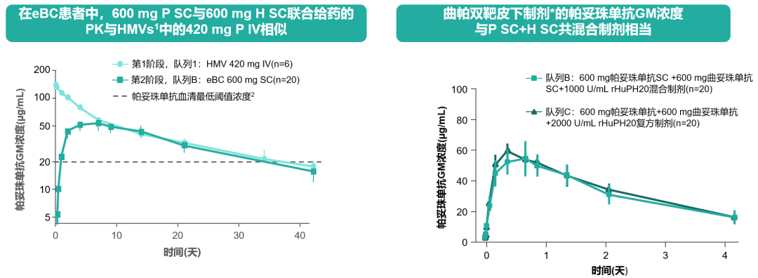 BO30185研究确定了曲帕双靶皮下制剂的剂量标准[15,16],通过健康人群研究确定了帕妥珠单抗SC 1200mg+曲妥珠单抗SC 600mg的负荷剂量以及帕妥珠单抗SC 600mg+曲妥珠单抗SC 600mg的维持剂量;并且在早期乳腺癌患者中,单剂量P-SC单独给药或与H-SC组合(混合或联合配制)的PK相似[15,16]。