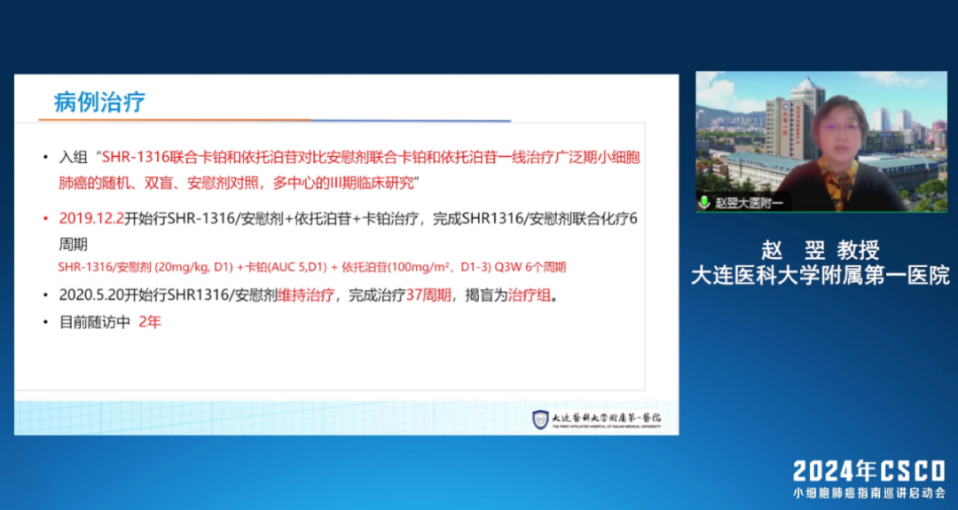 大连医科大学附属第一医院赵翌教授分享一位晚期SCLC患者诊疗过程,该患者确诊左肺小细胞癌(cT4N+M1)IV期肺转移癌,一线治疗入组SHR-1316临床研究,行SHR-1316+依托泊苷+卡铂治疗,完成SHR-1316联合化疗6周期,后行SHR-1316维持治疗,完成治疗37周期,疗效评价达到PR,PFS大于42个月,目前患者在随访过程中,安全性良好,主要不良反应为轻微甲减。系统化疗结束后按照ES-SCLC诊疗原则给予预防性全脑照射,患者目前无颅内进展。综合来看,本例患者一线治疗采用阿得贝利单抗与化疗的联合方案,其治疗效果令人满意,显著提升了患者的生存获益,充分验证了阿得贝利单抗不仅疗效卓越,而且安全耐受,易于管理。