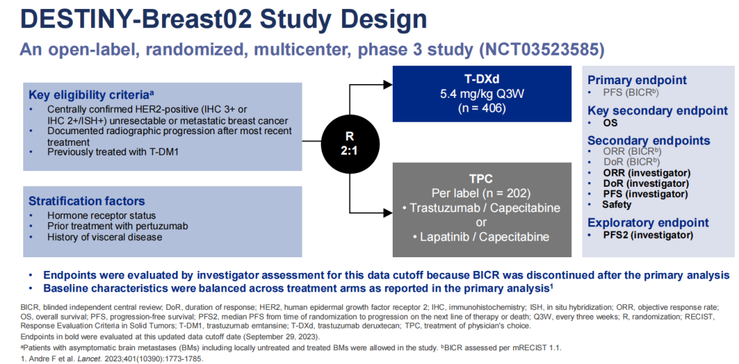 [5].AndréF,Hee Park Y,Kim S,et al.Trastuzumab deruxtecan versus treatment of physician’s choice in patients with HER2-positive metastatic breast cancer(DESTINY-Breast02):a randomised,open-label,multicentre,phase 3 trial[J].Lancet,2023.DOI:10.1016/s0140-6736(23)00725-0.