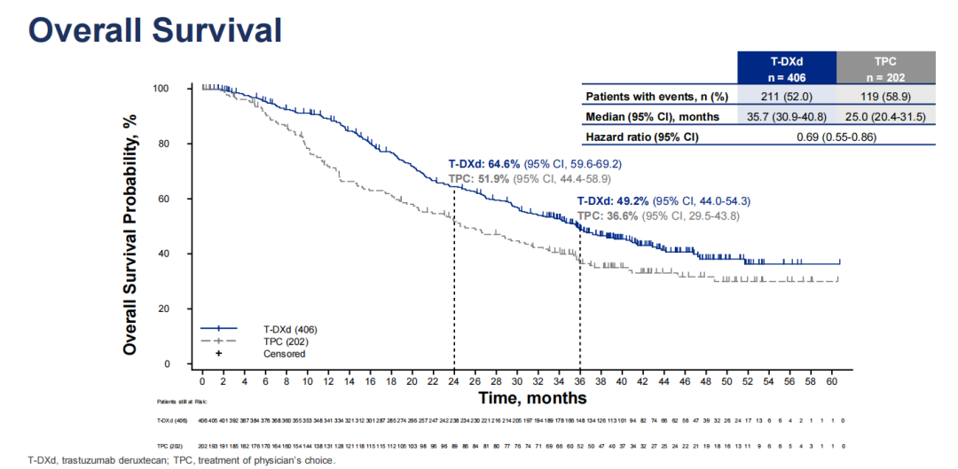 共有608名患者被随机分配(T-DXd组,n=406;TPC组,n=202)。在数据截止时,T-DXd组和TPC组的中位随访时间分别为30.2个月(0.8~60.7)和20.5个月(0.0~60.6)。