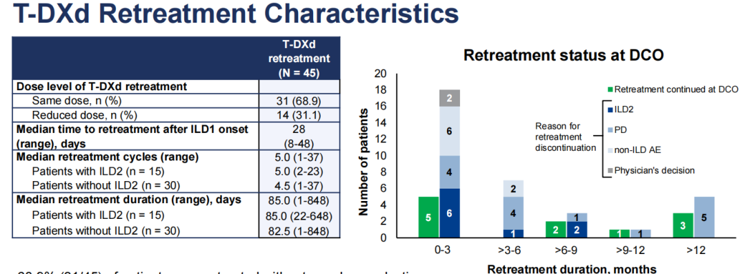 患者再治疗的中位持续时间为85天,在重新接受治疗的患者中,有68.9%(31/45)的患者维持T-DXd原始剂量继续治疗,有31.1%(14/45)接受了比原始剂量低一级的T-DXd剂量。此外,有17.8%(8/45)的患者再治疗持续时间超过了一年。