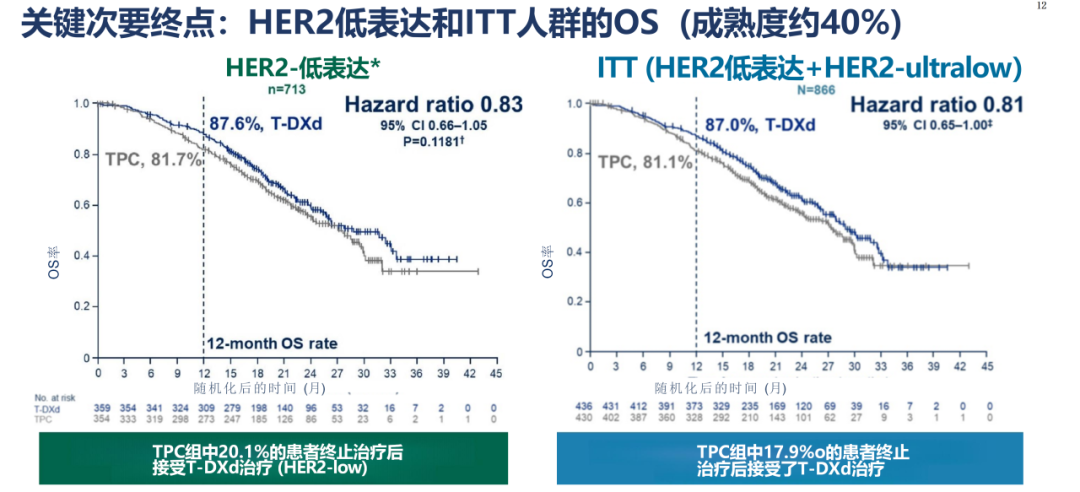 截至分析时,OS数据尚未成熟。但与TPC组相比,T-DXd组在HER2低表达人群(HR 0.83,95%CI:0.66~1.05)和ITT人群(HR 0.81,95%CI:0.65~1.00)中,均已显示出OS获益的趋势。HER2低表达和ITT人群分别有20.1%和17.9%的TPC组患者在停药后接受了T-DXd治疗。